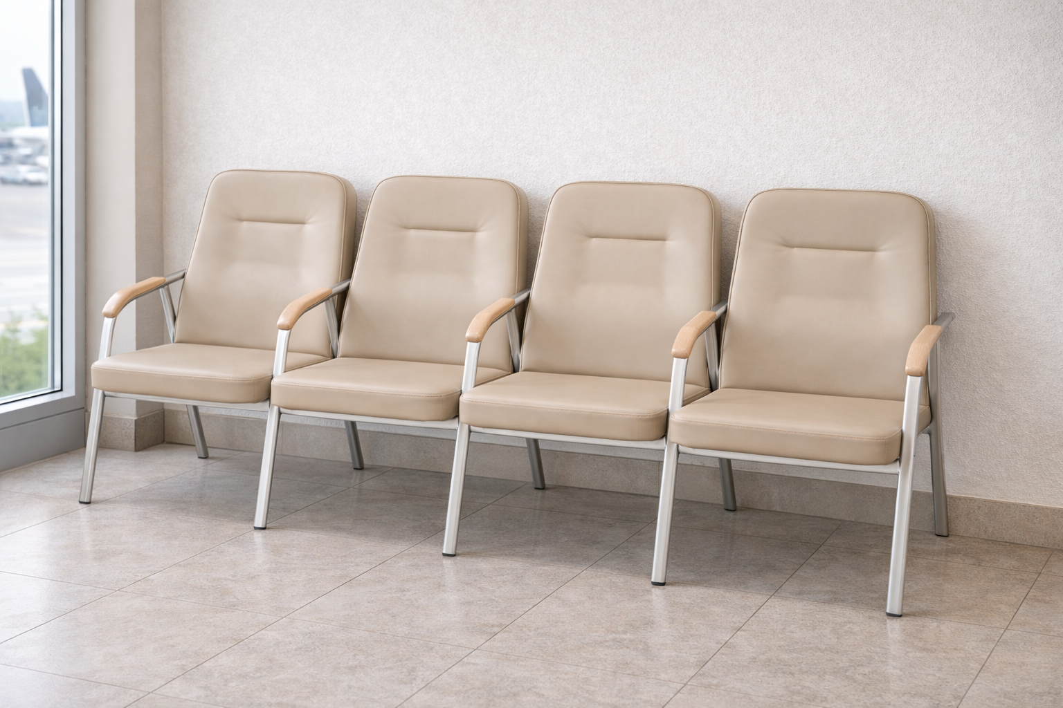 Чотиримісна секція крісел з м'якими сидіннями та підлокітниками — це зручне та естетичне рішення для зон очікування у поліклініках, бізнес-центрах, вокзалах та інших громадських просторах. Каркас виконаний із міцного металевого профілю з антикорозійним покриттям, стійким до інтенсивної експлуатації. Широкі сидіння та високі спинки оббиті щільним, легким у догляді матеріалом, забезпечуючи високий рівень комфорту навіть за умови тривалого перебування. Підлокітники з дерев'яними накладками створюють додаткову зручність для відвідувачів та надають секції завершеного, сучасного вигляду. Ергономічна конструкція та практичні матеріали роблять цю модель універсальним рішенням як для класичних, так і для сучасних інтер'єрів.