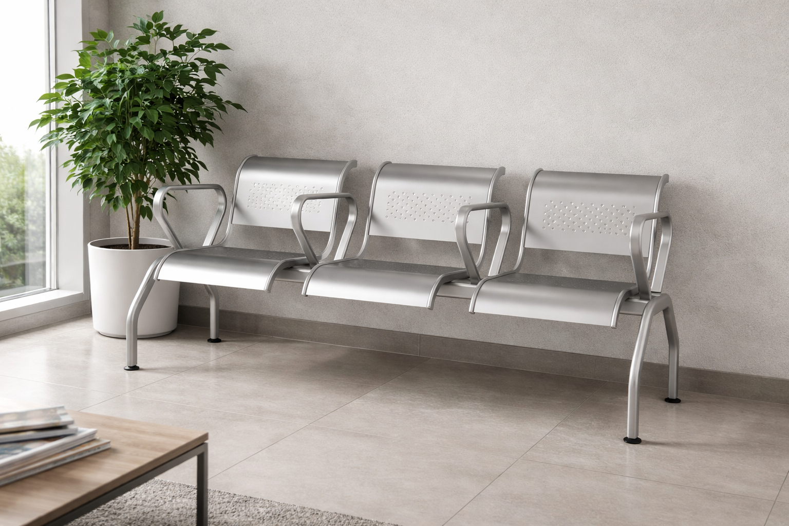 Трехместная перфорированная секция стульев с подлокотниками «РИМ 330» — это надежное и комфортное решение для обустройства зон ожидания в общественных и административных пространствах. Конструкция выполнена из прочной стали с долговечным порошковым покрытием, устойчивым к механическим повреждениям и износу. Эргономично изогнутые сиденье и спинка с перфорацией обеспечивают вентиляцию и удобство даже при длительном использовании. Подлокотники добавляют дополнительный комфорт и визуально разграничивают посадочные места, что особенно актуально в условиях повышенной посещаемости. Устойчивый металлический каркас и пластиковые заглушки на ножках защищают пол и гарантируют безопасность при эксплуатации. Современный лаконичный дизайн и нейтральная цветовая гамма делают эту модель универсальным вариантом для оформления интерьеров медицинских учреждений, офисов, вокзалов и других общественных мест.