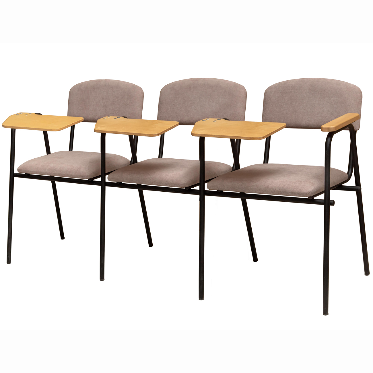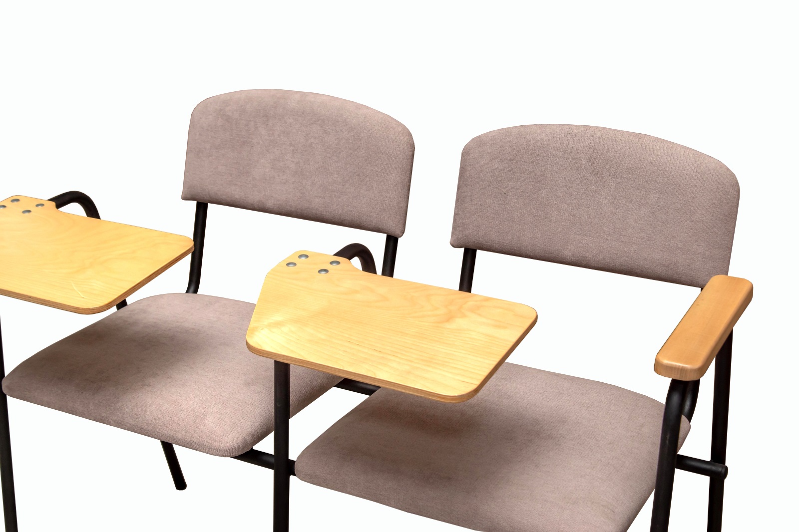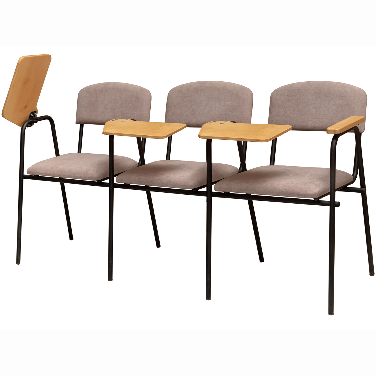 Секція стільців зі столиком Сієна є зручним і функціональним рішенням для навчальних аудиторій, конференц-залів і бізнес-центрів. Каркас виконаний із міцного металу, покритого порошковою фарбою. Сидіння та спинки м'які, оббиті зносостійкою тканиною, що гарантує комфорт при тривалому використанні. Особливістю даної моделі є дерев'яні підлокітники та столик-пюпітр, які можуть бути тоновані у потрібний колір відповідно до інтер'єру приміщення. Столик виготовлений із міцної фанери та покритий захисним лаком, стійким до вологи та механічних пошкоджень. Він оснащений механізмом підйому та фіксації, що дозволяє зручно розмістити навчальні матеріали або ноутбук.