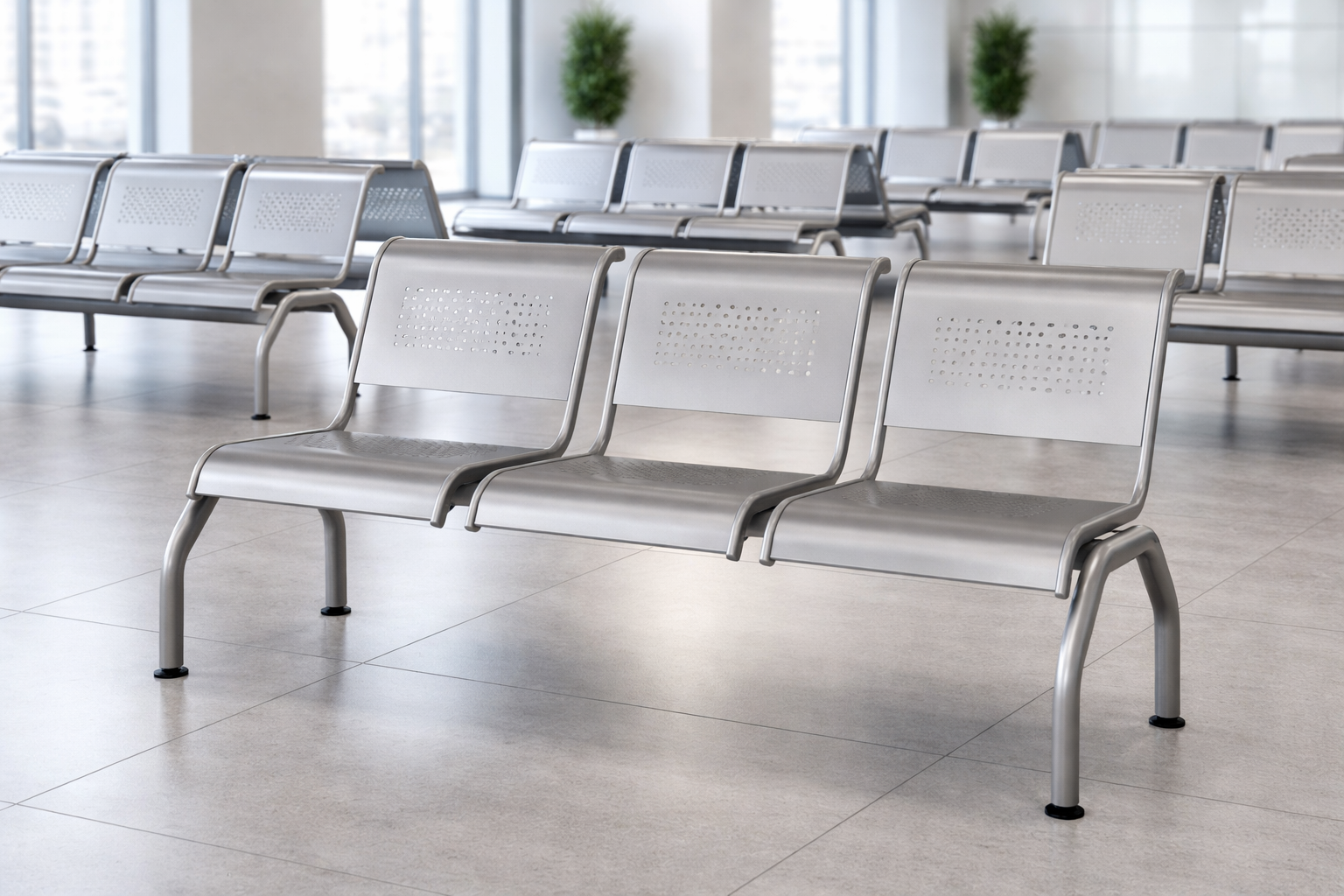 Тримісна перфорована секція стільців «РИМ 300» - це практичне та надійне рішення для облаштування зон очікування у громадських та комерційних приміщеннях. Модель виконана з високоміцної сталі із зносостійким порошковим покриттям, що забезпечує довгий термін служби навіть за інтенсивної експлуатації. Ергономічна форма сидінь та спинок, виконаних з перфорованого металу, сприяє комфорту та вентиляції при тривалому перебуванні. Цільнозварний каркас надає конструкції стійкості, а пластикові заглушки на ніжках захищають покриття підлоги від пошкоджень. Завдяки сучасному мінімалістичному дизайну та універсальним кольорам, секція органічно впишеться в інтер'єр медичних установ, адміністративних будівель, аеропортів, вокзалів та інших громадських просторів.